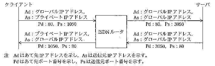 アドレスを、ISDNルータのグローバルIPアドレスヘ変換します。このとき、
